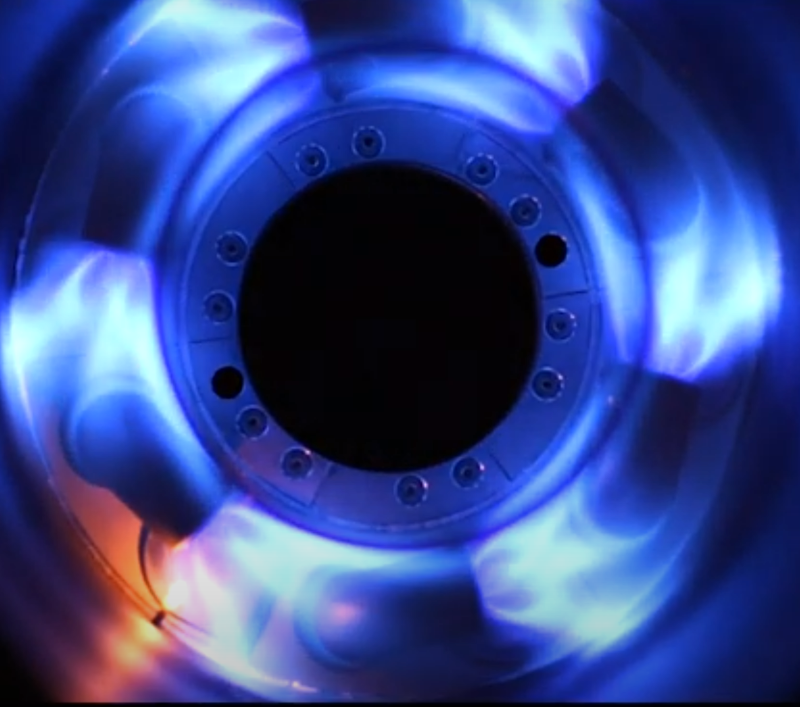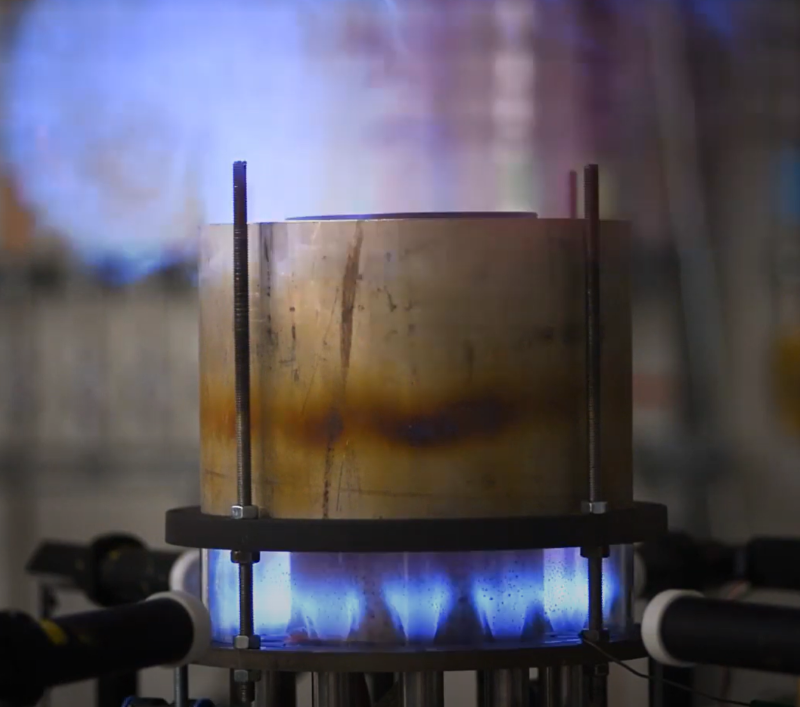 A media outreach clip showing the ignition light-around process of a laboratory-scale combustor.